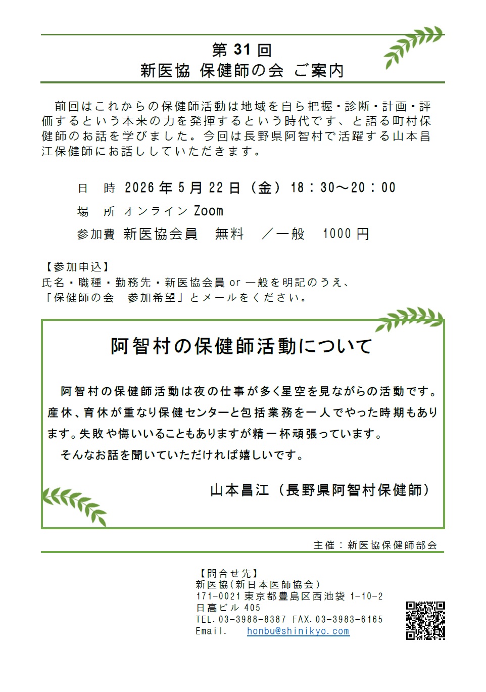 氏名・職種・勤務先・新医協会員or一般を明記のうえ、新医協へ「保健師の会 参加希望」とメールをください。折り返しご連絡いたします。どなたでもご参加いただけます。(